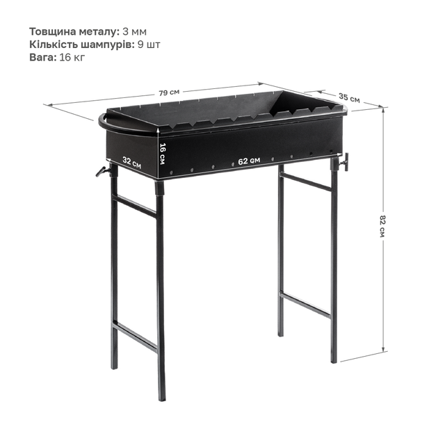 Жарівня мангалу на ніжках виготовлена з металу завтовшки 3 мм і пофарбована термостійкою емаллю чорного кольору, що витримує температуру до 800°C.