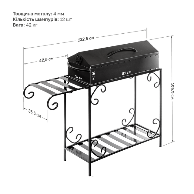 Комплект поставки: жаровня, дровниця, бокова поличка - 1шт, металева решітка гриль - 1 шт