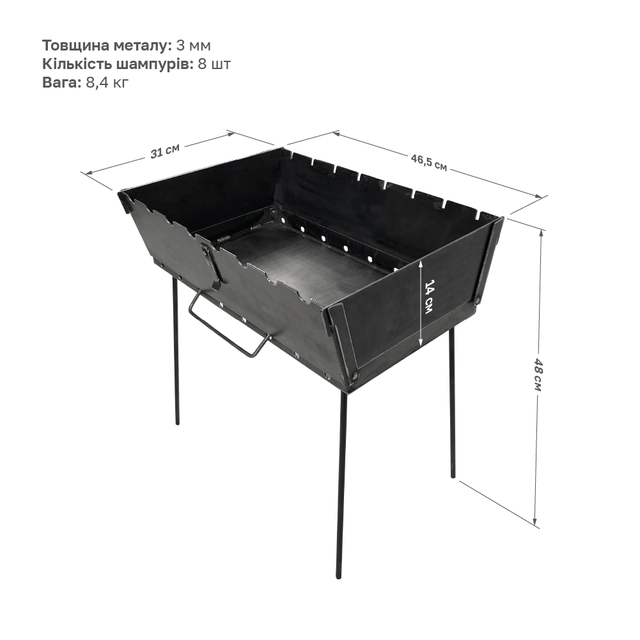 Наш мангал відрізняється портативністю та компактністю. Він легко складається в валізку, що робить його ідеальним супутником для пікніків, відпочинку на пляжі та інших пригод на свіжому повітрі.